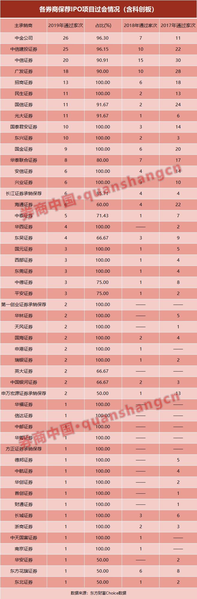 過會率來看,有31家券商上會項目均圓滿過關(guān),其中招商證券、民生證券、國泰君安、東興證券等上會項目都在10個以上(含10),能保持100%的過會率,難能可貴;國金、興業(yè)、安信、華西、西部等券商2019年IPO過會率也是100%。
