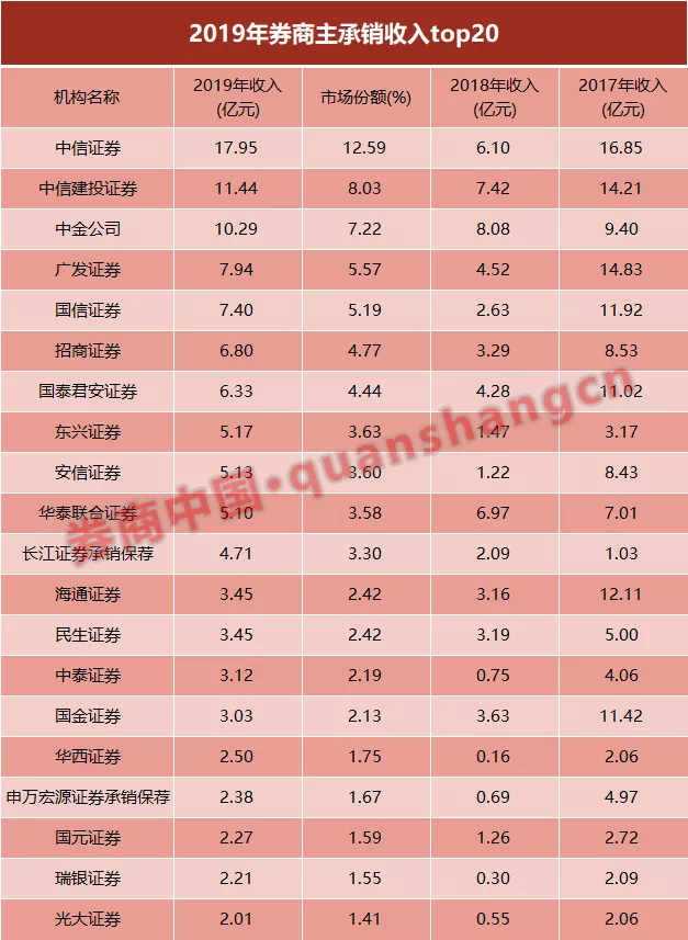2019年,全行業(yè)共獲得142.52億元的主承銷收入,較2018年的83.3億元增加七成。其中,中信證券以17.95億元的主承銷收入排名第一,占據(jù)12.59%的市場份額;中信建投證券、中金公司主承銷收入排名二、三,均超10億元。