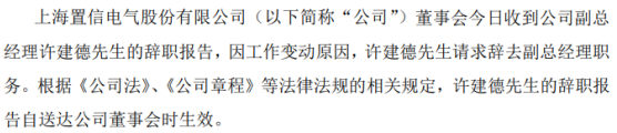 1月6日消息,近日置信電氣(600517)董事會(huì)今日收到公司副總經(jīng)理許建德的辭職報(bào)告。