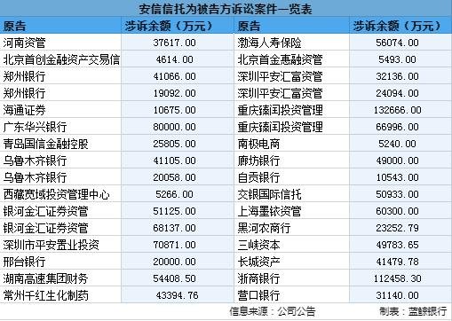 而安信信托目前還有多宗處于被告地位的訴訟案件。3月13日公告顯示,目前其尚在審理中的案件金額22.7億元,已撤訴案件金額5000萬元。據(jù)藍鯨財經(jīng)不完全統(tǒng)計,目前該公司為被告方的訴訟案件達28件,其中涉及浙商銀行(4.060, -0.02, -0.49%)、鄭州銀行(3.930, -0.02, -0.51%)、海通證券(13.120, -0.03, -0.23%)等多家金融機構(gòu)。