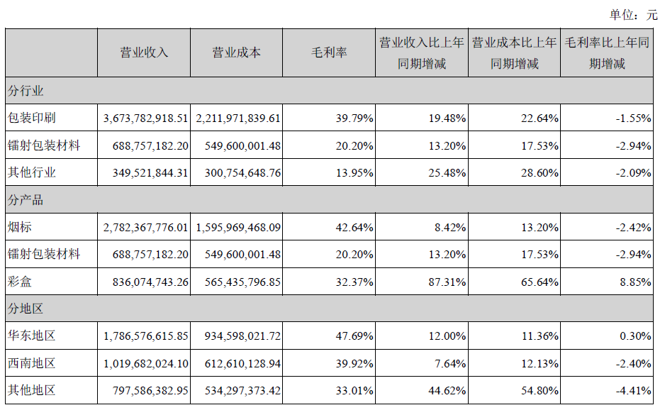 如在中高端白酒包裝領(lǐng)域,加大對(duì)參股子公司貴州省仁懷市申仁包裝印務(wù)有限責(zé)任公司的投資力度,進(jìn)行生產(chǎn)改擴(kuò)建項(xiàng)目,夯實(shí)現(xiàn)有酒類包裝業(yè)務(wù),積極拓展茅臺(tái)集團(tuán)外酒類及其他包裝業(yè)務(wù),預(yù)定的建設(shè)規(guī)模為年產(chǎn)滿足15萬(wàn)噸白酒的紙質(zhì)包裝品以及20萬(wàn)箱煙標(biāo);與四川宜賓 五糧液(129.260, 0.44, 0.34%) 精美印務(wù)有限責(zé)任公司設(shè)立合資公司宜賓嘉美智能包裝有限公司,全力打造西南智能化煙酒、食品等包裝領(lǐng)先企業(yè)。報(bào)告期內(nèi),公司彩盒產(chǎn)品銷售收入比上年同期增長(zhǎng)87.31%。