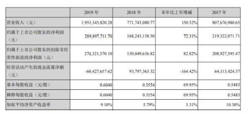 據(jù)了解,2019年度,公司實現(xiàn)營業(yè)收入193,334.38萬元,較上年增加116,160.07萬元;歸屬上市公司股東的凈利潤為28,989.77萬元,較上年同期增加72.31%。扣除非經常性損益后歸屬上市公司股東的凈利潤為27,432.16萬元,較上年同期增加82.82%。2019年末凈資產為357,417.77萬元,較上年增長10.68%;總資產624,350.15萬元,較上年增長9.52%。