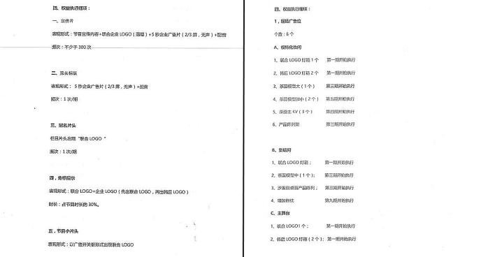 1066號合同的執(zhí)行權(quán)益細項為宣傳片、冠名標(biāo)板、冠名片頭、角標(biāo)提示、節(jié)目小片頭、片尾壓屏、片尾鳴謝、口播+字幕版、15秒硬廣;1033號合同的執(zhí)行權(quán)益細項為現(xiàn)場廣告位、真人秀倒計時、女神出場:轉(zhuǎn)場+壓屏、女神返場音樂、幸運之星(聯(lián)合logo+女神名字+競品價格)、主題定制、口播+字幕版、15秒硬廣。