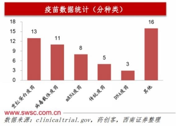 目前全球有超90家單位競相開展新冠疫苗的研發(fā)項(xiàng)目60余個(gè);已進(jìn)入臨床階段的包括COV001(牛津大學(xué))、腺病毒疫苗(康希諾)、Moderna的Mrna-1273等5個(gè)品種;其中核酸疫苗進(jìn)度最快;從疫苗分類看,重組蛋白疫苗占比最高達(dá)到23%、病毒載體疫苗為20%、核酸疫苗為19%;目前全球范圍內(nèi)疫苗研發(fā)的機(jī)構(gòu)中,中國占比過半,其次為美國。