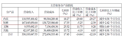 不過即便文胸銷量逆勢增長,但浪莎股份內(nèi)衣和短褲才是營收貢獻的大頭。而這兩部分的營收紛紛同比大降,內(nèi)衣銷售實現(xiàn)營收1.1億元,同比下滑29.6%;短褲銷售實現(xiàn)營收1.7億元,同比下滑5.25%。實際上,浪莎股份產(chǎn)品本身的毛利率就不高,這兩項業(yè)務(wù)的毛利率也出現(xiàn)了同比下滑。