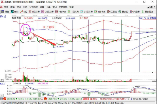長上影線是一個明顯的見頂信號。上漲行情中,股價上漲到一定階段,成交量連續(xù)或連續(xù)上漲3-5個交易日,日換手率在4%以上。當成交出現(xiàn)最大值時,其換手率往往超過10%。這意味著主力在拉和出貨,如果收盤時有長上影線,則意味著高價回落,而且賣出壓力較大。如果第二天的股價不能恢復到前一天的上影線,成交將開始萎縮。則表明市場前景將會調整。在這種情況下,應該堅決減倉甚至是清倉。