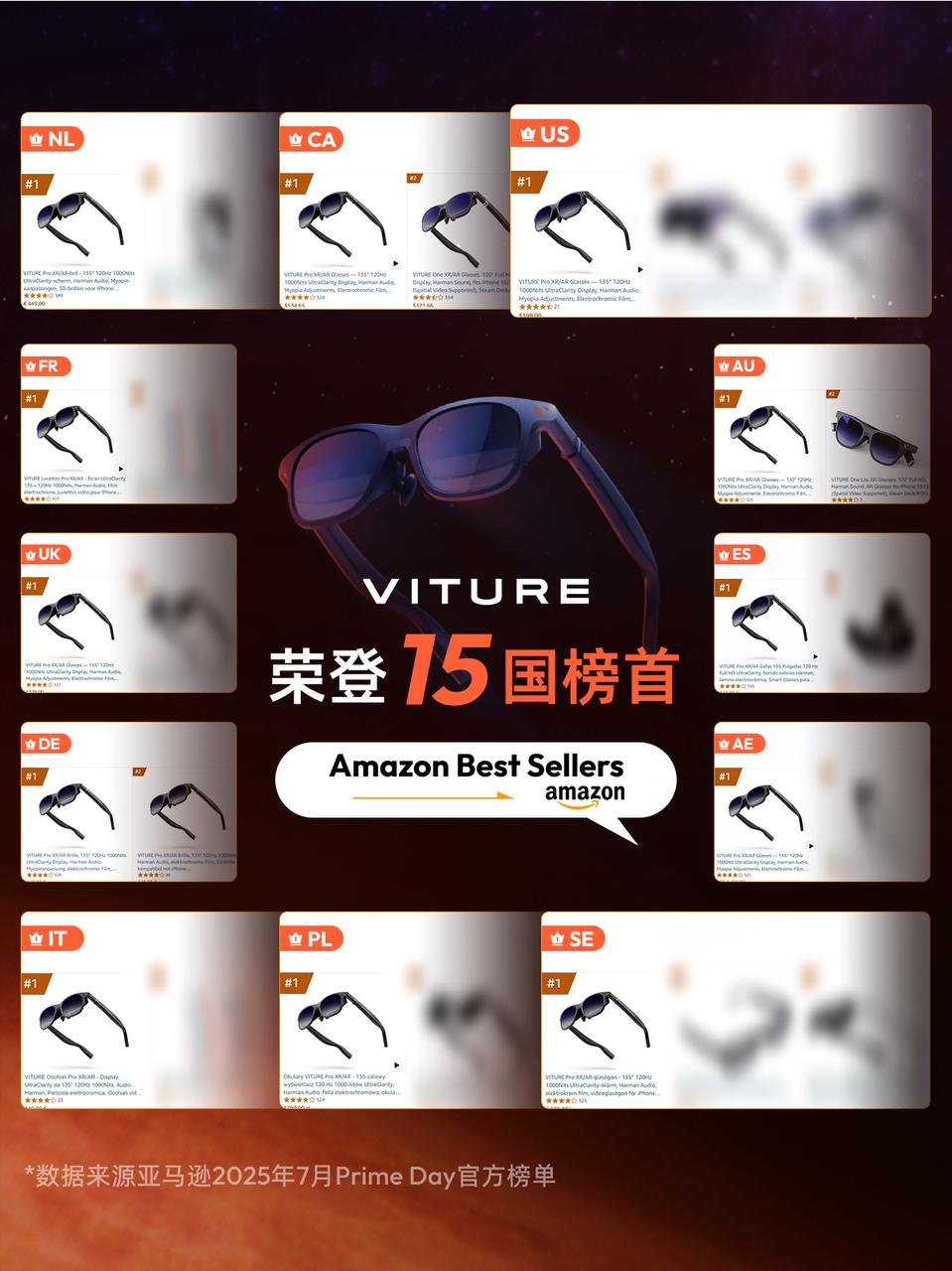 2025年7月,亞馬遜Prime Day購物狂歡開啟,有全球500萬Switch2玩家的全力支持,VITURE一口氣拿下美國、加拿大、法國、英國、澳大利亞等15個(gè)歐美國家的亞馬遜AR品類銷量冠軍。VITURE一向低調(diào),雖然在國內(nèi)剛?cè)刖植痪?,但在歐美已然是隱形冠軍。