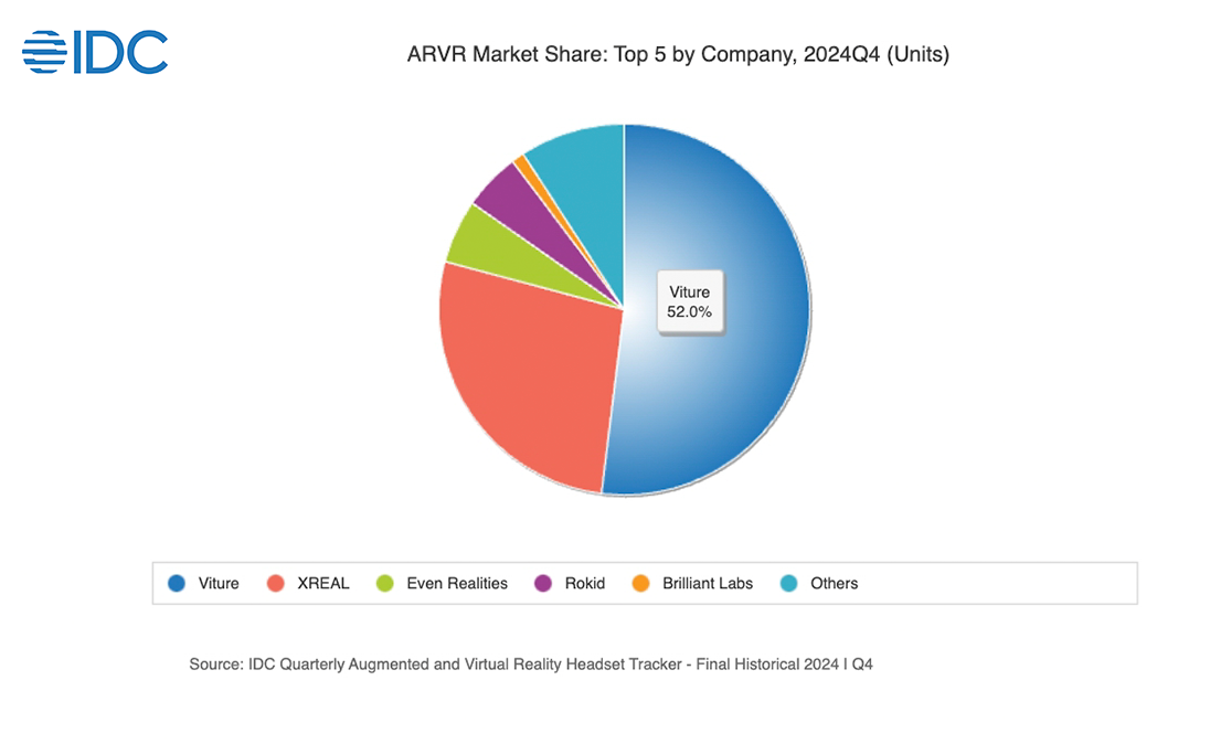 人前小透明,背后真實(shí)力,VITURE的實(shí)力不允許他低調(diào)。國際權(quán)威機(jī)構(gòu)IDC數(shù)據(jù)顯示,2024年第四季度,VITURE以52%的市場份額,位居北美AR眼鏡市場銷量第一,霸占了北美AR眼鏡市場半壁江山。