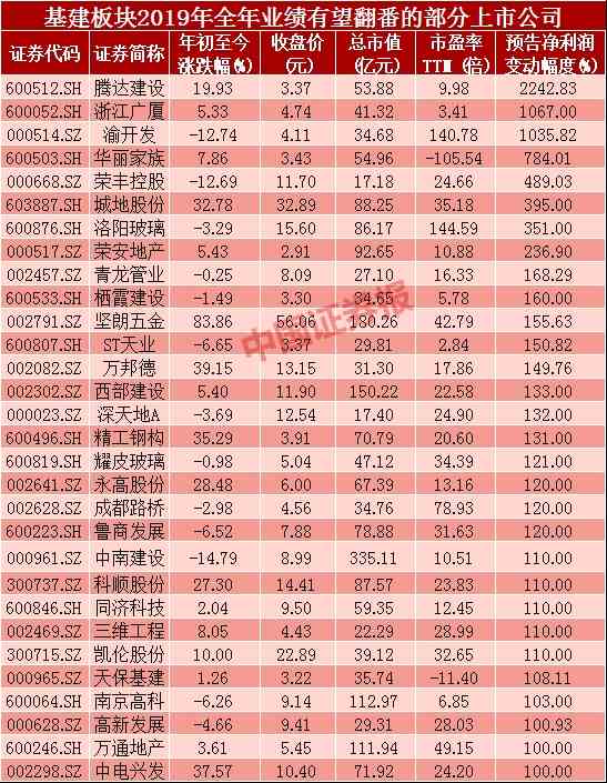 從業(yè)績(jī)來看,截止發(fā)稿,基建板塊共有159家上市公司公布了2019年業(yè)績(jī)預(yù)告,101家預(yù)喜(含20家扭虧),占比64%。從凈利潤(rùn)同比增長(zhǎng)率來看,30家公司業(yè)績(jī)有望翻番。