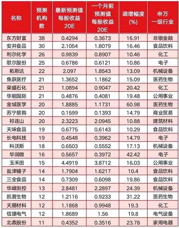 統(tǒng)計(jì)數(shù)據(jù)顯示,近一月內(nèi)機(jī)構(gòu)一致預(yù)測(cè)凈利調(diào)整幅度大于10%、預(yù)測(cè)機(jī)構(gòu)數(shù)大于5家的公司共有41家(見(jiàn)表2)。進(jìn)一步來(lái)看,包括東方財(cái)富、利爾化學(xué)、歌爾股份等在內(nèi)的13家公司180天內(nèi)均獲得超過(guò)20家機(jī)構(gòu)給予推薦關(guān)注。