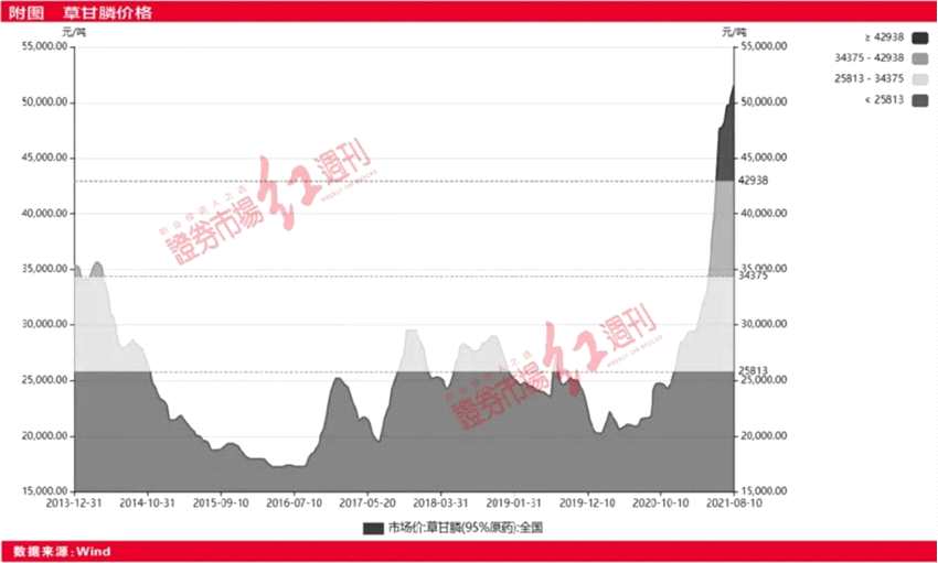實際上,化工公司之所以實現(xiàn)業(yè)績翻倍的家數(shù)最多,離不開化工品連續(xù)漲價的“支撐”?!都t周刊》記者注意到,今年以來,化工品如醋酸、草甘膦等密集漲價。8月18日,醋酸國內(nèi)現(xiàn)貨價報收6100元/噸,相較于年初的4300元/噸上漲42%。8月10日,草甘膦(95%原藥)市場價已達到51500元/噸,相較于去年1月的20300元/噸,漲幅已達150%。(見附圖)