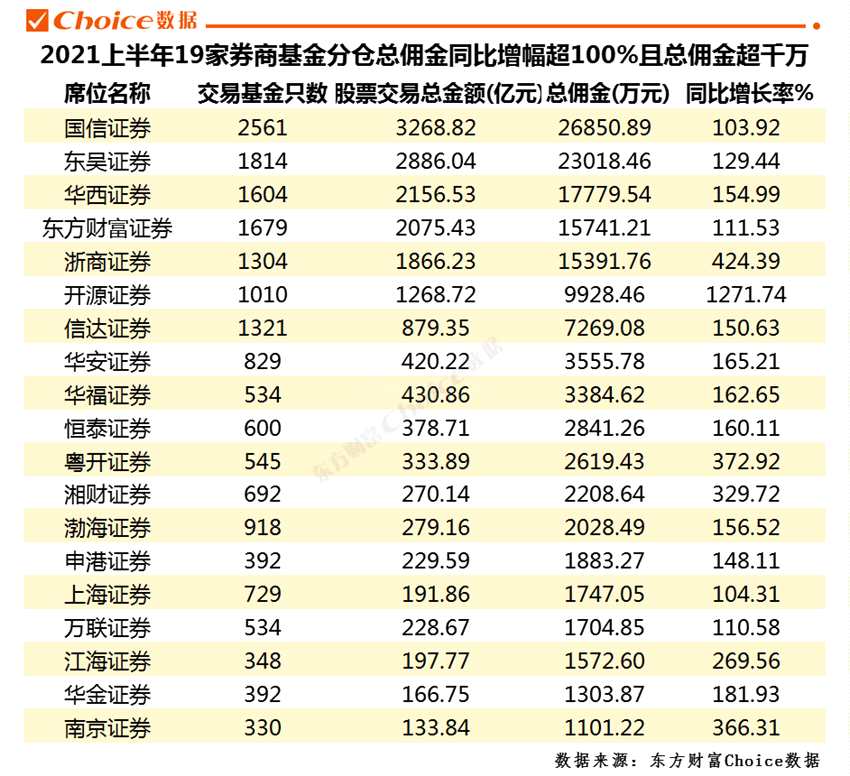 39家券商傭金上半年增速超100%,其中,國信證券、東吳證券、華西證券、東方財富證券和浙商證券總傭金超1億,共19家券商總傭金超千萬且增速翻番。