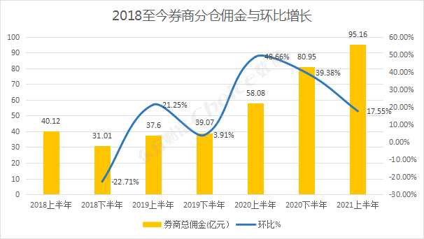 數(shù)據(jù)統(tǒng)計(jì)顯示,2021上半年,股票交易、債券交易、回購交易總額達(dá)到80.22萬億元?;鸸緸槿特暙I(xiàn)傭金總計(jì)95.16億元,環(huán)比增速17.55%,較2020上半年的58.08億元大幅上漲63.84%。