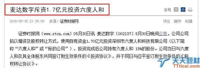 摘要: 麥達數(shù)字(002137)2016年投資1.7億元獲得六度人和15%股權,并共同籌資5億,成立了業(yè)內(nèi)第一支SaaS產(chǎn)業(yè)基金。