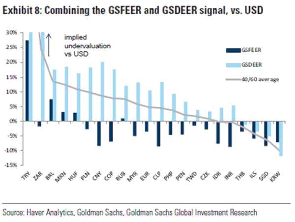 根據(jù)高盛的研究,匯率下跌使得巴西雷亞爾、墨西哥比索、南非蘭特和俄羅斯盧布的貿(mào)易加權(quán)匯率看起來(lái)很便宜。與此同時(shí),土耳其里拉的貶值幅度超過(guò)了該國(guó)經(jīng)濟(jì)失衡所要求的貶值水平。