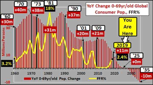 Hamilton悲觀地預(yù)測(cè),如果這次的經(jīng)濟(jì)周期擴(kuò)張階段在2019年結(jié)束,美國(guó)傳統(tǒng)的應(yīng)對(duì)策略,如降息及刺激性政策的效果將是二戰(zhàn)以來(lái)最弱的。因?yàn)?019年全球主要消費(fèi)群體增長(zhǎng)將僅增長(zhǎng)1100萬(wàn)人。