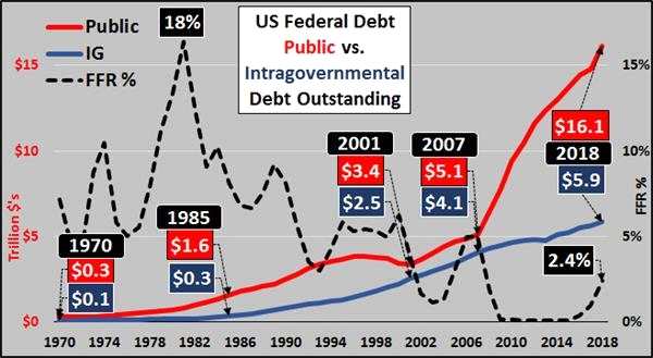 另一方面,美國(guó)聯(lián)邦政府債務(wù)不斷攀升,不論是所欠外債還是欠美國(guó)政府內(nèi)部其他部門的債務(wù)。其中,美國(guó)聯(lián)邦政府的外債在2007年后激增,2018年超過(guò)16萬(wàn)億美元。