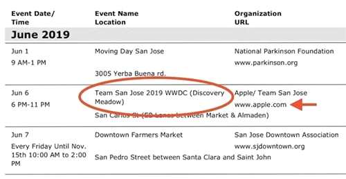 日前,外媒從圣何塞市文化事務(wù)辦公室的一個(gè)2019年活動(dòng)日歷中發(fā)現(xiàn)了端倪,該日歷列出了6月6日晚在Discovery Meadow將舉辦WWDC Bash,該活動(dòng)被注明為“圣何塞2019年WWDC團(tuán)隊(duì)”,組織者則是“Apple”,也就是說,這本活動(dòng)日歷已經(jīng)明確表示了蘋果WWDC的正式召開日期。