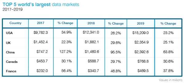 根據(jù)OnAudience在2018年8月發(fā)布的報(bào)告,2018年全球數(shù)據(jù)市場營收預(yù)計(jì)超過200億美元,同時(shí)預(yù)測2019年將會(huì)增長至260億美元,這還只是單純花費(fèi)在購買數(shù)據(jù)上的費(fèi)用。