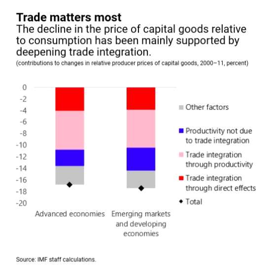 在WEO第3章“資本品的價格:投資驅(qū)動因素受到威脅?”中,IMF通過對40個經(jīng)濟體的30多個部門的價格數(shù)據(jù)進行分析發(fā)現(xiàn),貿(mào)易一體化是機械和設(shè)備價格相對于消費價格下降的最大因素。