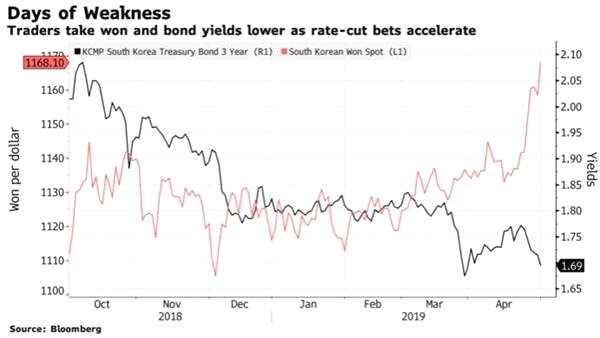 上周公布的數(shù)據(jù)顯示,由于出口下滑和半導(dǎo)體需求疲弱,韓國(guó)經(jīng)濟(jì)第一季度意外萎縮,市場(chǎng)對(duì)韓國(guó)央行將降息的押注也明顯增加。韓元當(dāng)天跌破關(guān)鍵支撐位,并將跌幅擴(kuò)大至兩年多低點(diǎn)。
