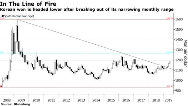 由于貿(mào)易緊張局勢(shì)升級(jí),本月韓元兌美元匯率下跌約2.3%,很快就將觸及1,200韓元的水平。韓元是今年亞洲表現(xiàn)最差的貨幣,其受到芯片出口大幅放緩的沖擊,而貿(mào)易則損害了韓國(guó)的經(jīng)濟(jì)前景。韓國(guó)財(cái)政部長(zhǎng)Hong Nam-ki周一表示,這可能對(duì)韓國(guó)經(jīng)濟(jì)造成比目前更大的打擊。