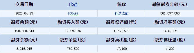 科達(dá)潔能(600499)融資融券信息(04-23)