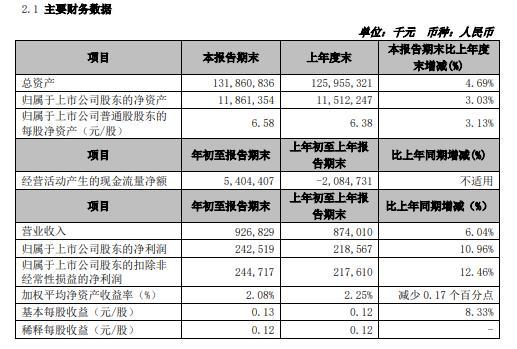 4月24日消息,蘇農(nóng)銀行(603323)近日發(fā)布2020年第一季度報(bào)告,公告顯示,年初至報(bào)告期末營業(yè)收入9.27億元,同比增長6.04%;歸屬于上市公司股東的凈利潤2.43億元,同比增長10.96%;基本每股收益0.13元,上年同期0.12元。