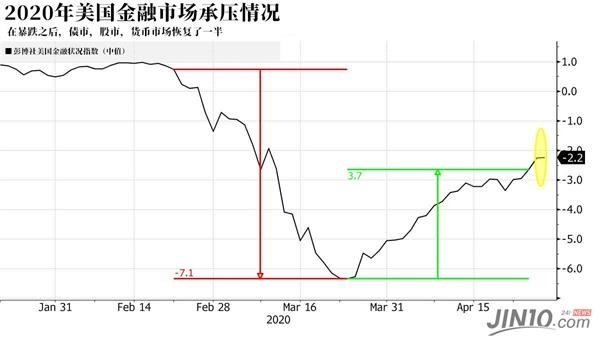 用于衡量股市、債市和貨幣市場壓力狀況的彭博美國金融狀況指數(shù)連續(xù)下滑一個月后,于3月的第三個星期觸底,隨后開始回升,收復了原先跌幅的一半左右。該指數(shù)由一系列宏觀指標構(gòu)成,如利率、信貸息差、股票價格、匯率水平、標普500的VIX波動率等。
