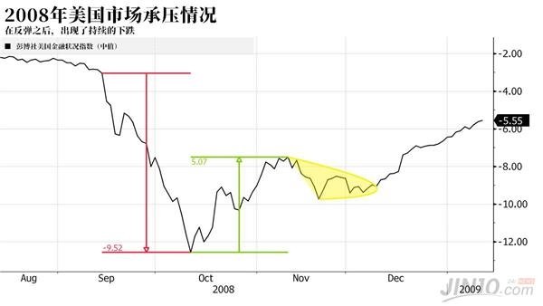 但無論如何,雖然彭博美國金融狀況指數(shù)的走勢目前得到了緩解,但是一些痛點依然存在。垃圾債券利率和相對應(yīng)的國庫券的利差在過去幾周一直上升。而回看2008年,雖然在拋售潮后的一個星期該指數(shù)恢復了穩(wěn)定,但后來即使Libor-OIS的利差恢復了正常,該指數(shù)還是一路走高。
