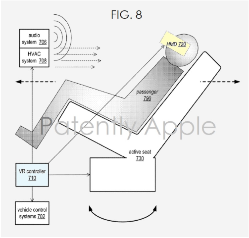 蘋果公司的專利圖8中展示了車輛的主動系統(tǒng),可能用于VR系統(tǒng),為乘客提供同步的物理效果。