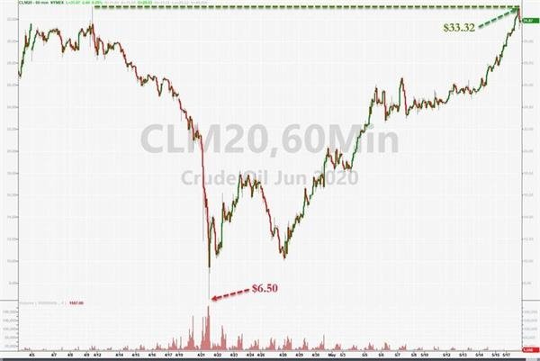 相比于美股,油價(jià)的漲幅更為驚人,美國(guó)WTI原油周一躍升至兩個(gè)多月來(lái)的最高水平,受市場(chǎng)對(duì)經(jīng)濟(jì)活動(dòng)恢復(fù)的樂(lè)觀情緒,以及有跡象表明產(chǎn)油國(guó)正在按計(jì)劃減產(chǎn)提振。布倫特原油期貨上漲2.31美元,至每桶34.81美元,漲幅7.1%;美國(guó)原油期貨上漲2.39美元,漲幅8.1%,至每桶31.82美元。