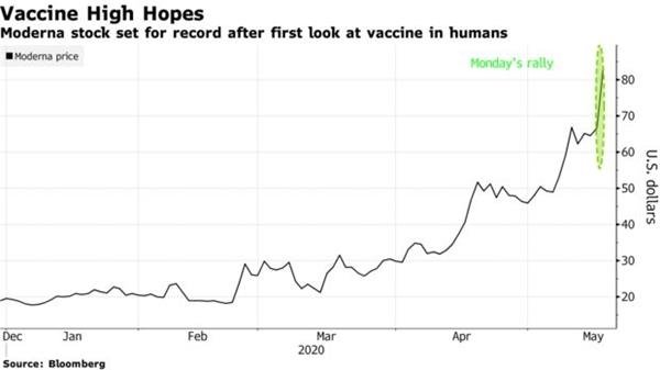 周一市場(chǎng)最重磅的利好無(wú)疑來(lái)自于疫苗研發(fā)。制藥商Moderna股價(jià)跳漲19.96%,此前該公司表示,其實(shí)驗(yàn)性新冠病毒疫苗在小規(guī)模早期試驗(yàn)中顯示出了令人鼓舞的結(jié)果。