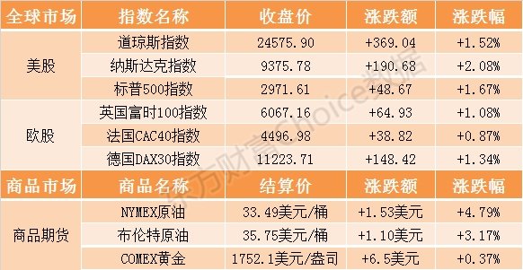 商品市場:國際油價雙雙收漲,美油期貨7月合約漲近5%。截止收盤,NYMEX 7月原油期貨收漲1.53美元,漲幅4.79%,報33.49美元/桶。布倫特7月原油期貨收漲1.10美元,漲幅3.17%,報35.75美元/桶。國際金價小幅上漲。截止收盤,紐約商品交易所黃金期貨市場交投最活躍的6月黃金期價20日比前一交易日上漲6.5美元,收于每盎司1752.1美元,漲幅為0.37%。