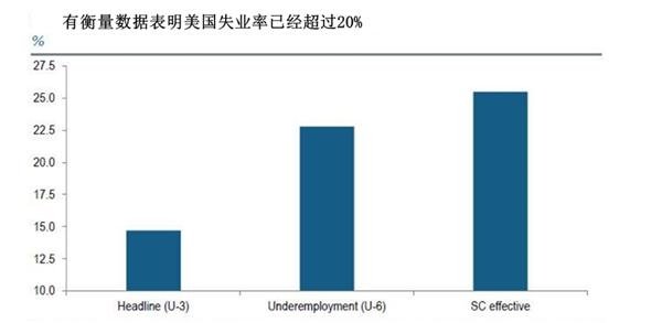 美國(guó)銀行現(xiàn)在認(rèn)為,失業(yè)率將在第二季度末達(dá)到19%的峰值。但有更廣泛的失業(yè)率衡量指標(biāo)表明,當(dāng)前失業(yè)率已經(jīng)超過了20%。在復(fù)蘇的最初階段,失業(yè)率將在經(jīng)濟(jì)重啟后急劇下降,但之后一段時(shí)間將保持在接近10%的位置。
