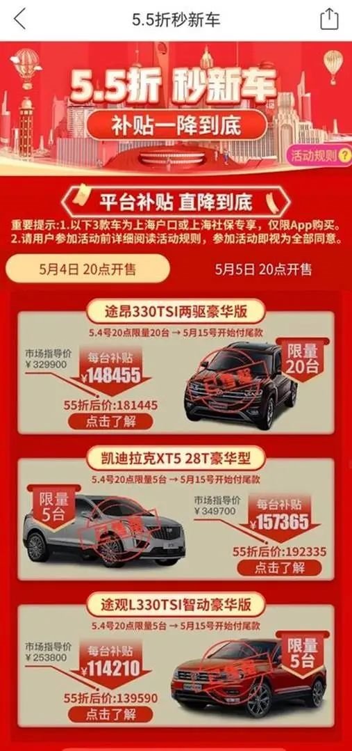 5月初,上海“五五購物節(jié)”期間,拼多多通過大額直降的方式推出一批“五五折”汽車。
