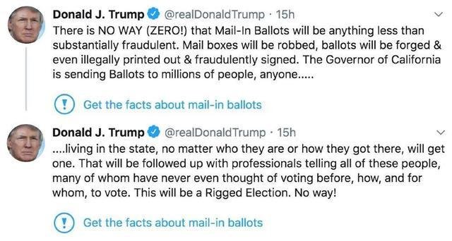 事情的起因是這樣的,據(jù)CNN報(bào)道,當(dāng)?shù)貢r(shí)間5月26日,社交媒體巨頭之一的推特公司在特朗普的兩條推文之下,添加“事實(shí)核查”的標(biāo)簽,這也是推特公司首次將此標(biāo)簽用在特朗普的推文之中。