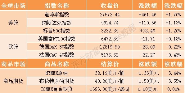 摘要: 美股全線收漲,納指漲1.13%,創(chuàng)收盤歷史新高,道指漲超450點(diǎn),漲幅1.70%,標(biāo)普500指數(shù)漲1.20%;美油跌3.44%,布油跌3.55%。