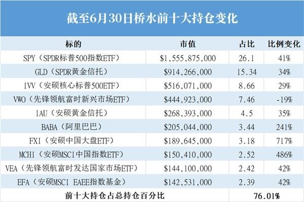 橋水的前十大持倉(cāng)股變化:一季度還在名單上的MSCI巴西指數(shù)ETF和幾個(gè)債券ETF,包括安碩Iboxx20期以上美債ETF、高收益?zhèn)鵈TF和投資機(jī)公司債ETF已經(jīng)不在名單內(nèi)。代替以上幾只ETF的“新寵”是一只黃金信托、2只跟蹤中國(guó)指數(shù)的ETF和阿里巴巴,其中SPDR Gold Trust 黃金ETF加倉(cāng)幅度達(dá)34%。