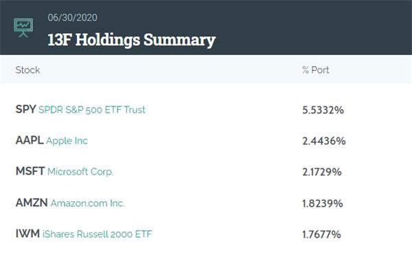 高盛集團(tuán)第二季度的持倉(cāng)市值從第一季度的 2838.41億美元大增16%至3293.79億美元,前五大持倉(cāng)分別為標(biāo)普500指數(shù)ETF、蘋果、微軟、亞馬遜和iShares羅素2000指數(shù)ETF。