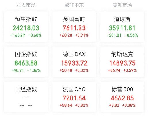亞洲股市方面,恒生指數小幅下跌0.68%,報24218點。國企指數下跌1.06%,報8464點。日經225指數NoneNone%,報0點。