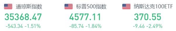 截至1月18日周二收盤,美國(guó)三大股指悉數(shù)下跌。道瓊斯指數(shù)下跌1.51%或543.34點(diǎn),報(bào)35368.47;標(biāo)普500指數(shù)下跌1.84%或85.74點(diǎn),報(bào)4577.11;納斯達(dá)克指數(shù)下跌2.6%或386.86點(diǎn),報(bào)14506.90。