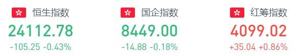 截至1月18日周二收盤,恒生指數(shù)下跌0.43%或105.25點(diǎn),報(bào)24112.78;國(guó)企指數(shù)下跌0.18%或14.88點(diǎn),報(bào)8449.00;紅籌指數(shù)上漲0.86%或35.04點(diǎn),報(bào)4099.02。