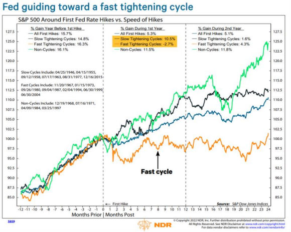 克利索德和NDR的高級量化分析師Thanh Nguyen在2月的一份說明中詳細介紹了“快”周期和“慢”周期的市場表現(xiàn)差異。他們發(fā)現(xiàn),在首次加息后的一年里,標普500指數(shù)在慢周期中平均上漲10.5%,而在快周期中平均下跌2.7%。