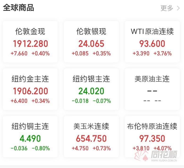 【全球商品】WTI原油主力合約收于每桶93.60美元,漲3.76%;布倫特原油主力合約收于每桶97.35美元,漲4.07%;隔夜上期所原油主力合約收于每桶588.10元,漲4.03%。
