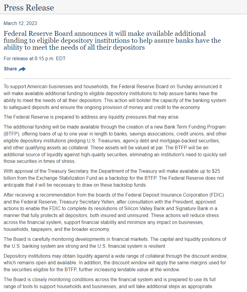 具體而言,額外的資金將通過(guò)創(chuàng)建新的銀行期限融資計(jì)劃(BTFP)提供,向銀行、儲(chǔ)蓄協(xié)會(huì)、信用合作社和其他合格的存款機(jī)構(gòu)提供最長(zhǎng)一年的貸款,以美國(guó)國(guó)債、機(jī)構(gòu)債務(wù)和抵押貸款支持證券以及其他合格資產(chǎn)為抵押。這些資產(chǎn)將按面值計(jì)價(jià)。