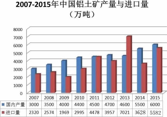 自2007年以來,中國鋁土礦國內(nèi)產(chǎn)量逐年增加,2015年達(dá)到破紀(jì)錄的6000萬噸。