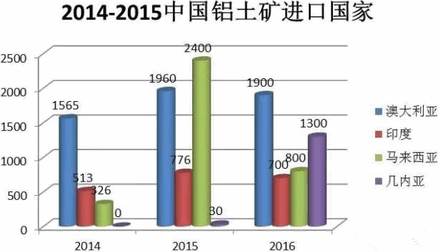 2017年幾內(nèi)亞有望超越澳大利亞成為中國最大鋁土礦進(jìn)口來源國,2014年幾內(nèi)亞對華出口鋁土礦數(shù)量微乎其微、可以忽略不計(jì);2015年幾對華出口鋁土礦30萬噸,2016年有望達(dá)到1300萬噸;2017年則有可能超越澳大利亞一躍成為中國最大的鋁土礦進(jìn)口來源國。
