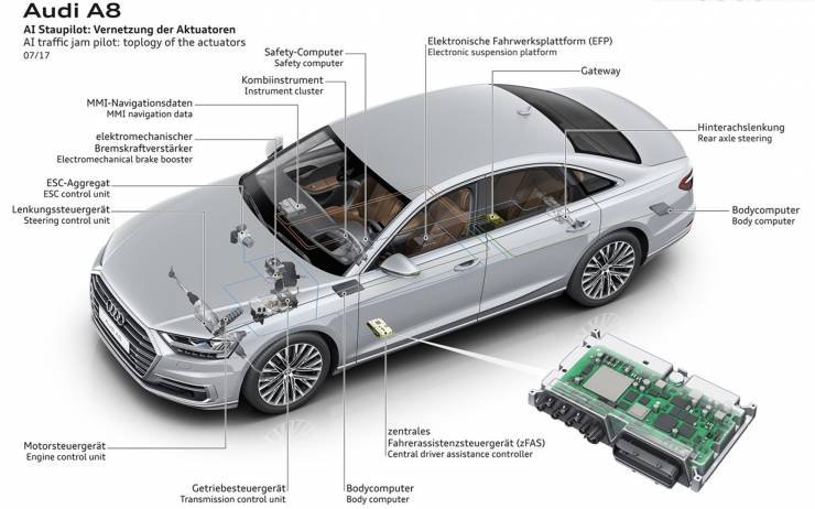 在新的A8上,用戶只要按下“Audi AI”的按鈕就能開啟道路擁堵狀況下的自動駕駛功能——即當(dāng)車速低于60公里每小時,自動駕駛系統(tǒng)將完全接管車輛,自行完成加速、減速和轉(zhuǎn)向等駕駛操作。