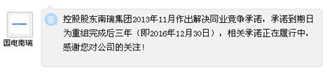 國(guó)電南瑞(600406)大股東國(guó)家電網(wǎng)承諾:在2016年12月30日前解決公司同業(yè)競(jìng)爭(zhēng)承諾,資產(chǎn)注入進(jìn)入倒計(jì)時(shí)3天。公司2013年11月向控股股東南瑞集團(tuán)發(fā)行股份購買集團(tuán)持有若干資產(chǎn),為此南瑞集團(tuán)承諾將在重組完成的三年之內(nèi)即(2016年12月30日),通過業(yè)務(wù)整合、股權(quán)轉(zhuǎn)讓、資產(chǎn)注入等合法合規(guī)的方式,解決南瑞繼保、中電普瑞、普瑞特高壓與公司之間的同業(yè)競(jìng)爭(zhēng)問題。結(jié)合當(dāng)前國(guó)企改革的大背景,國(guó)電南瑞的國(guó)企改革方案有望在本周推出,解決同業(yè)競(jìng)爭(zhēng)的核心企業(yè)南瑞繼保的收入和利潤(rùn)體量與上市公司基本相當(dāng),本次資產(chǎn)整合存在較大的想象空間,資產(chǎn)注入有望成就公司的干億市值之路。